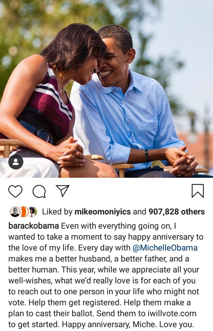 Michelle Obama wrote: "28 years with this one. I love @BarackObama for his smile, his character, and his compassion. So grateful to have him as a partner through everything life throws at us. And this year, we have a request for you — pick one person in your life who might not vote and make sure they do. Tell us about it in the comments! That’s an anniversary message of the best kind. Love you, Barack."