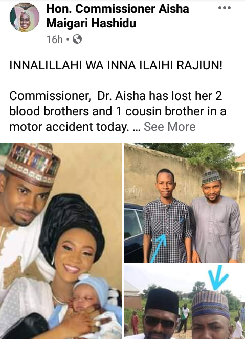 Gombe State Commissioner for Science, Technology and Innovation, Dr Aishatu Umar Maigari has lost three of her brothers to a ghastly motor accident.It was gathered that the motor accident occurred on Saturday, October 31, along Gombe-Kano road on their way to Kano.