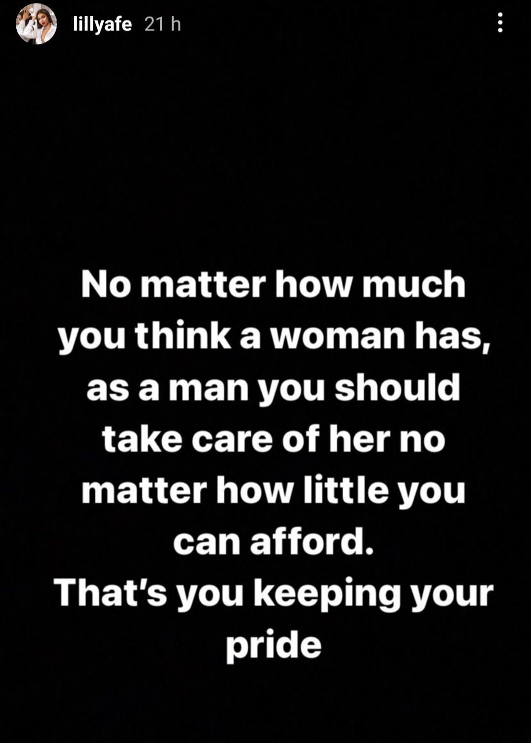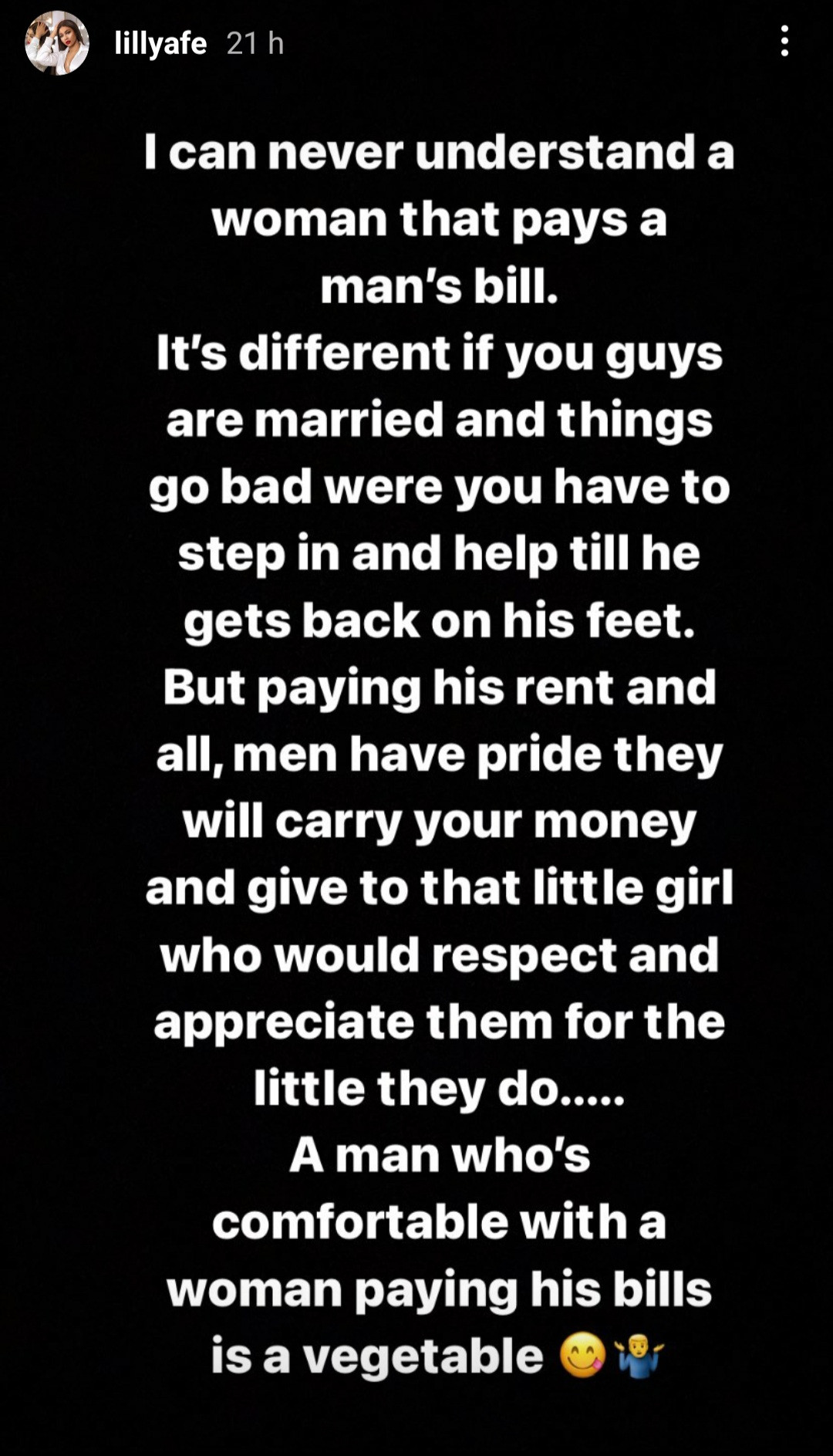 Actress, Lilian Afegbai has spoken against men who rely on women to take care of their every need. She pointed out that it's understandable if the man is married and falls on hard times and the wife steps in to help. However, she said a man who feels comfortable with a woman paying his bills is a "vegetable". She added that even if the woman has more, the man should keep his pride by trying to take care of her with the little he has. Read her post below.